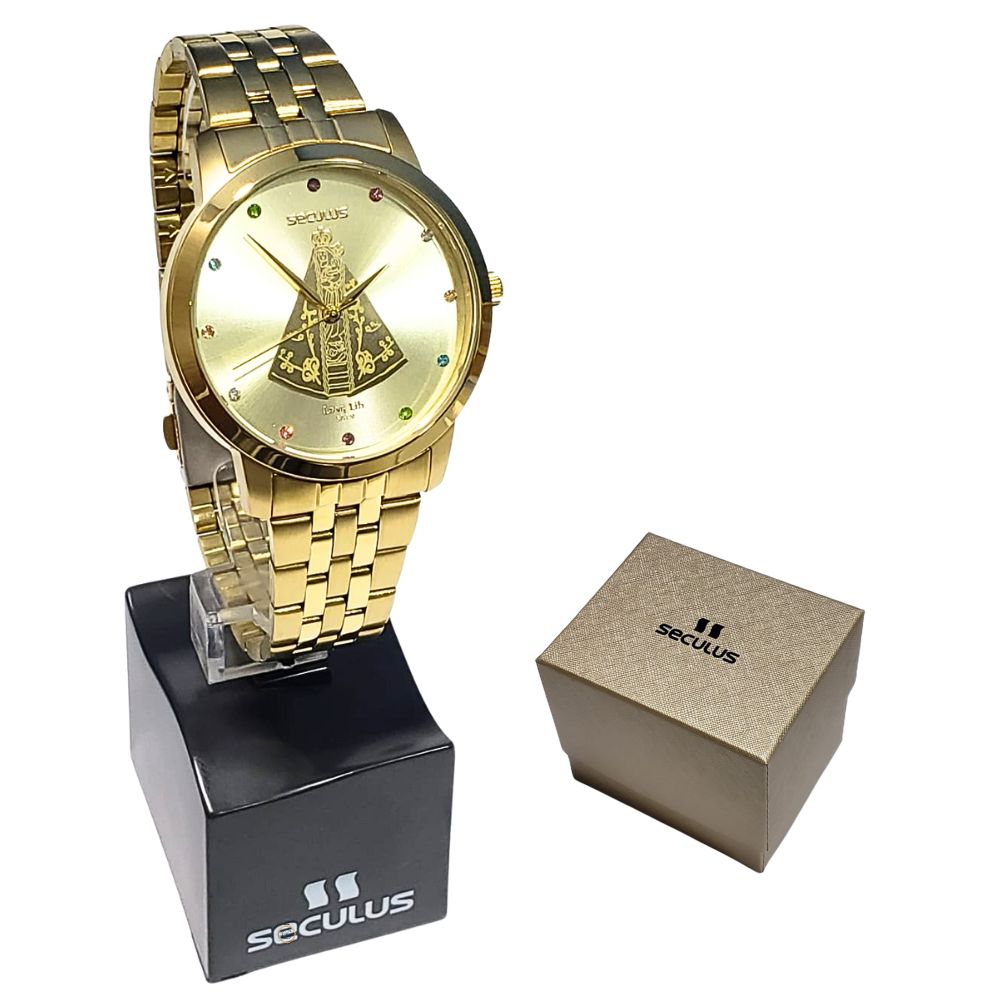 Kit para os religiosos. Vem com um relógio analógico dourado todo em aço, trazendo como destaque o mostrador com a imagem de Nossa Senhora de Nazaré e marcadores em cristais coloridos. Como brinde, ainda vem um colar dourado com pingente da Nossa Senhora de Nazaré e pedraria colorida para combinar com o relógio.