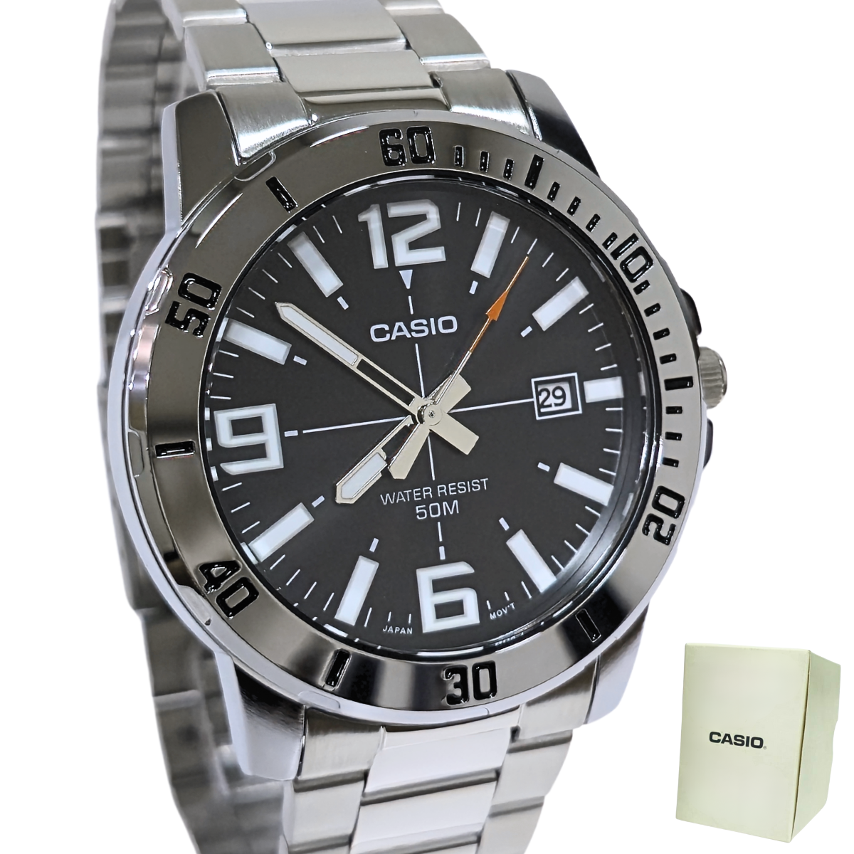 MTP-VD01D-1BVUDF é um modelo clássico, com caixa em aço e pulseira em aço inoxidável, calendário, resistência à água de até 50 metros, ideal para o seu dia a dia.