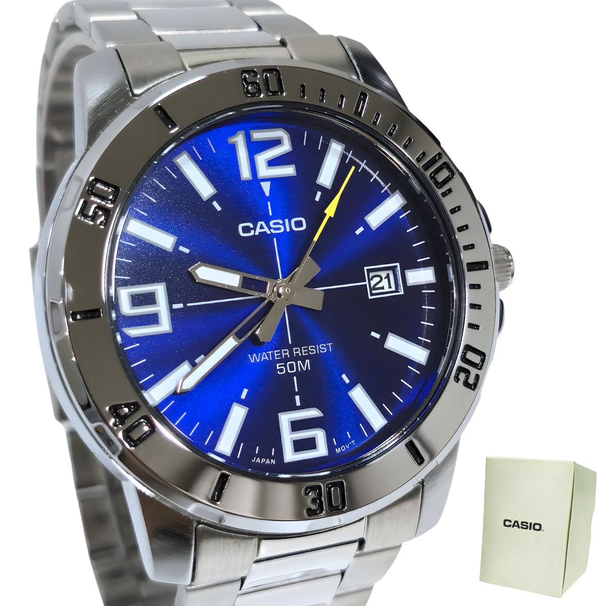 MTP-VD01D-2BVUDF é um modelo clássico, com caixa em aço e pulseira em aço inoxidável, calendário, resistência à água de até 50 metros, ideal para o seu dia a dia.