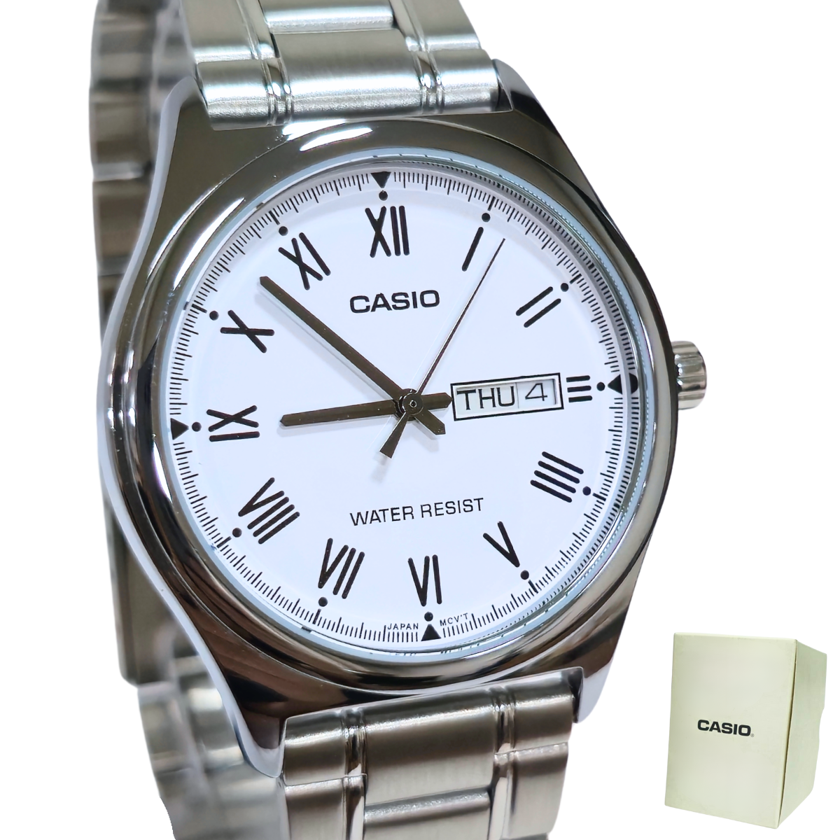 Prático, bonito e funcional, o Relógio Casio Digital MTP-V006D-7BUDF vai complementar o seu look. Com fundo branco e numerais romanos e calendário espanhol e inglês, além de ser resistente à água para rotinas diárias. Você vai adorar este lindo relógio da Casio!