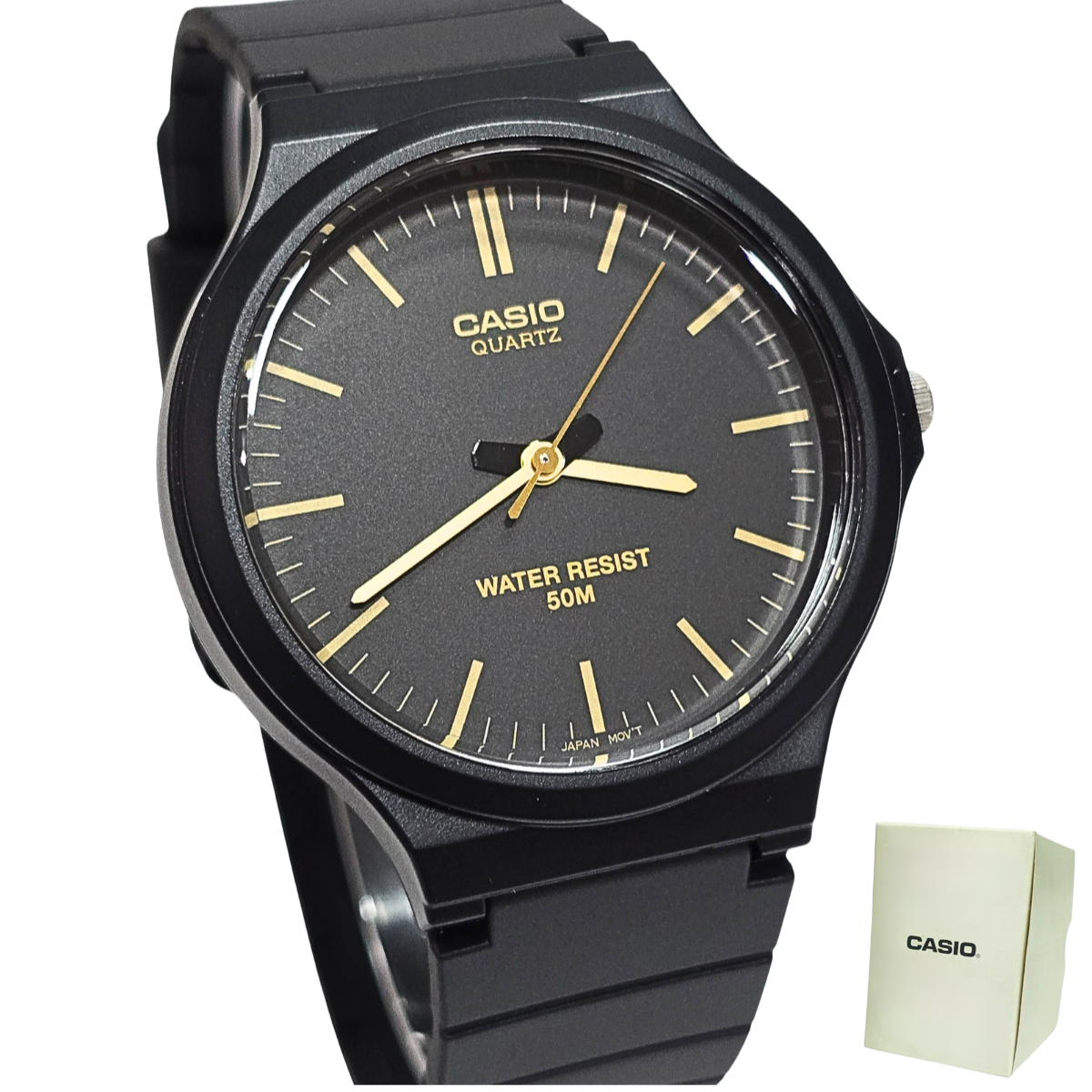 Design simples para atender as necessidades do dia a dia. Mostrador preto, com marcadores e ponteiros dourados. Resistente à água 50 metros, caixa grande, proporciona conforto e elegância.