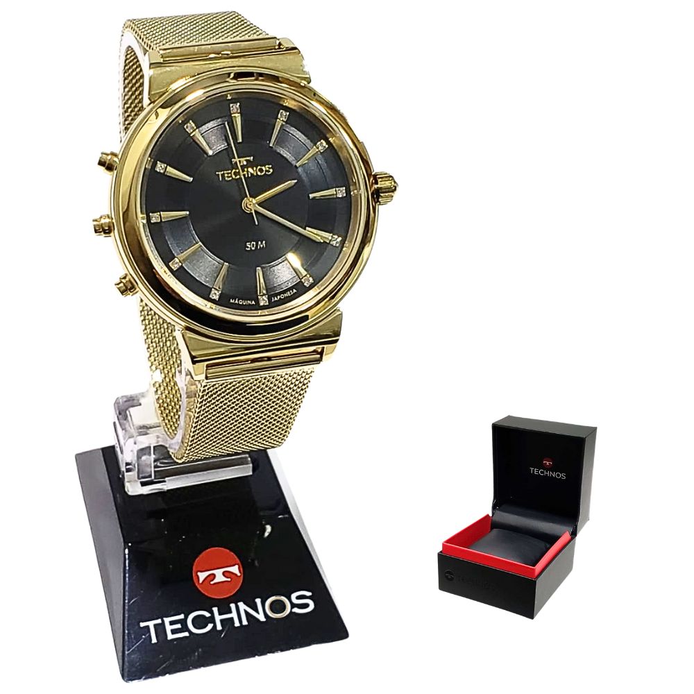 Relógio Technos feminino Curvas dourado. Com traços marcantes, construção inovadora e caixa reversível, este modelo apresenta um movimento giratório sutil e surpreendente, que revela seus dois maquinismos, um lado analógico e outro digital. É um modelo versátil, ideal para qualquer ocasião, com caixa 40 mm, pulseira de aço mesh em banho dourado e mostrador preto