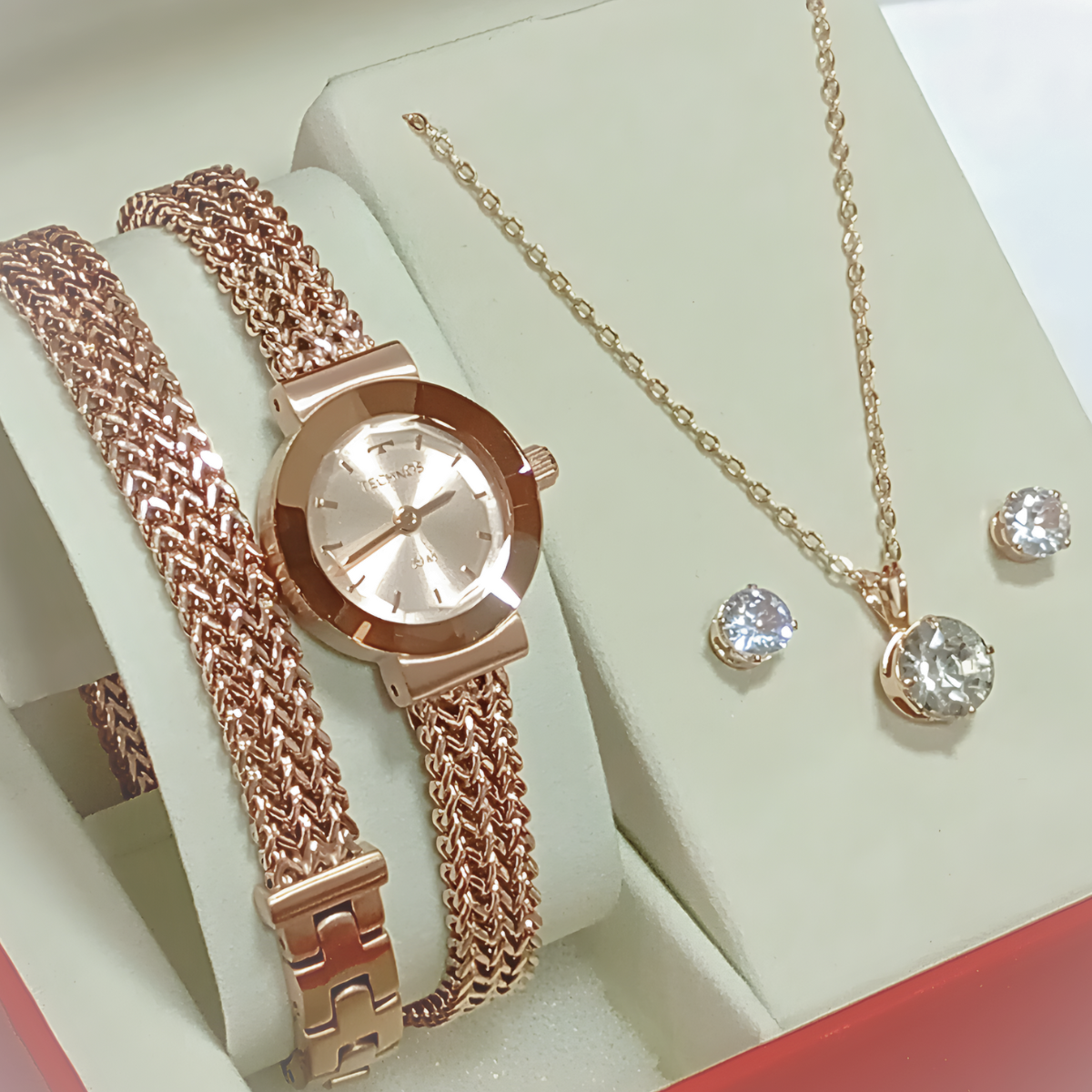 Relógio Technos Mini feminino redondo, rosé, analógico, com caixa de aço e pulseira de mesh em duas voltas no pulso. Resistente à água em até 5 ATM. Acompanha um lindo kit com colar e par de brincos, tornando-o uma excelente opção para presentear com charme e estilo.