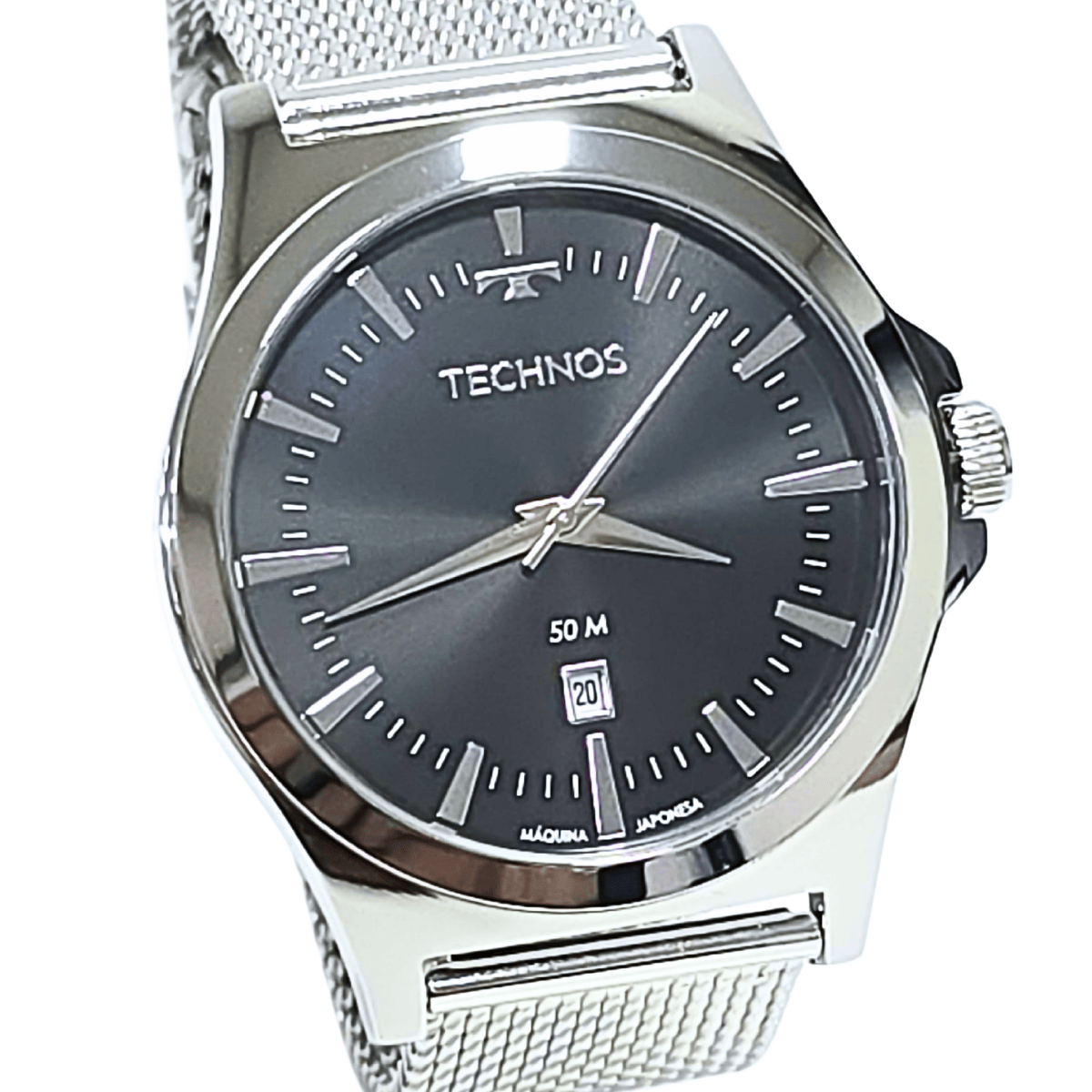 Relógio Technos Steel prata. Modelo com caixa best seller e pulseira de mesh em banho prata. A pulseira de mesh se ajusta perfeitamente ao pulso, dando ao relógio um toque clássico combinado com a imponente caixa da linha Steel com mostrador preto.