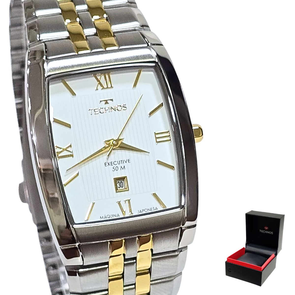 Relógio Technos Masculino Analógico Executive 1N12MQ/5B, com caixa e pulseira de aço. A elegância desse modelo é traduzida através da sua caixa quadrada clássica e da aplicação bicolor na pulseira.