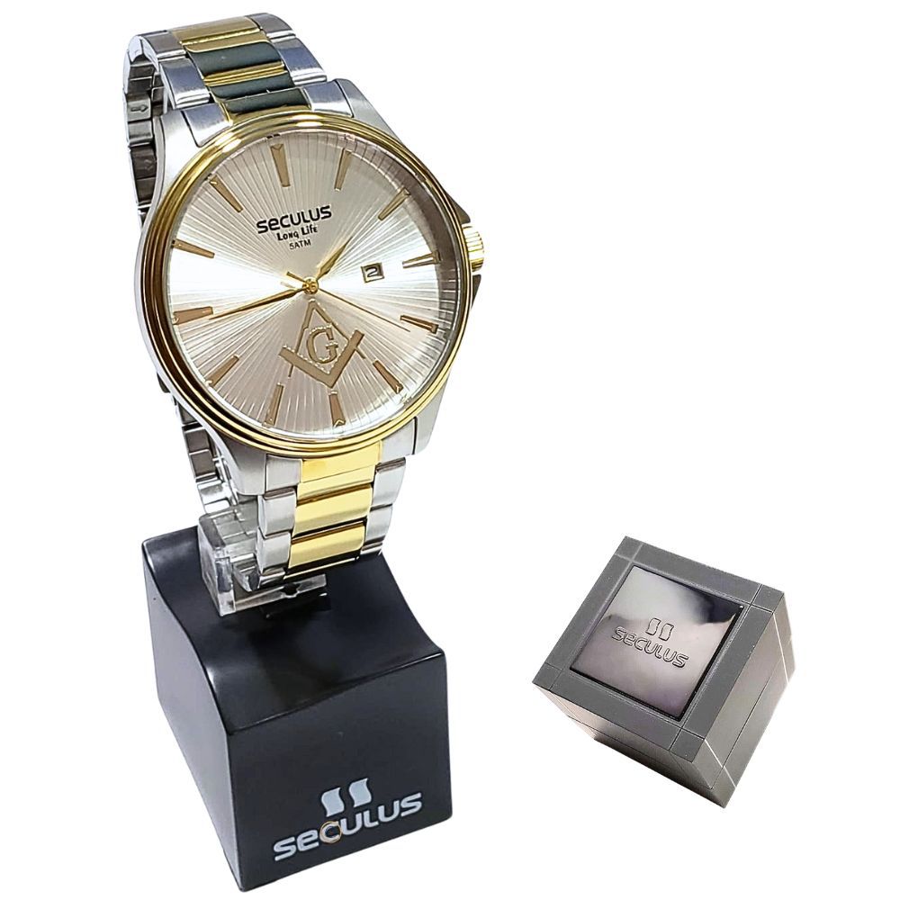 Com estilo esportivo, este relógio analógico possui caixa cromada em aço com numeração externa, mostrador Este relógio analógico com calendário é a perfeita combinação de clássico e sofisticado. Fabricado inteiramente em aço, apresenta um elegante contraste entre prata e dourado, com um mostrador minimalista texturizado e o símbolo da maçonaria. Versátil e democrático, adapta-se a todos os tamanhos de pulso. A caixa, com 4,6 cm de diâmetro, oferece presença e estilo.