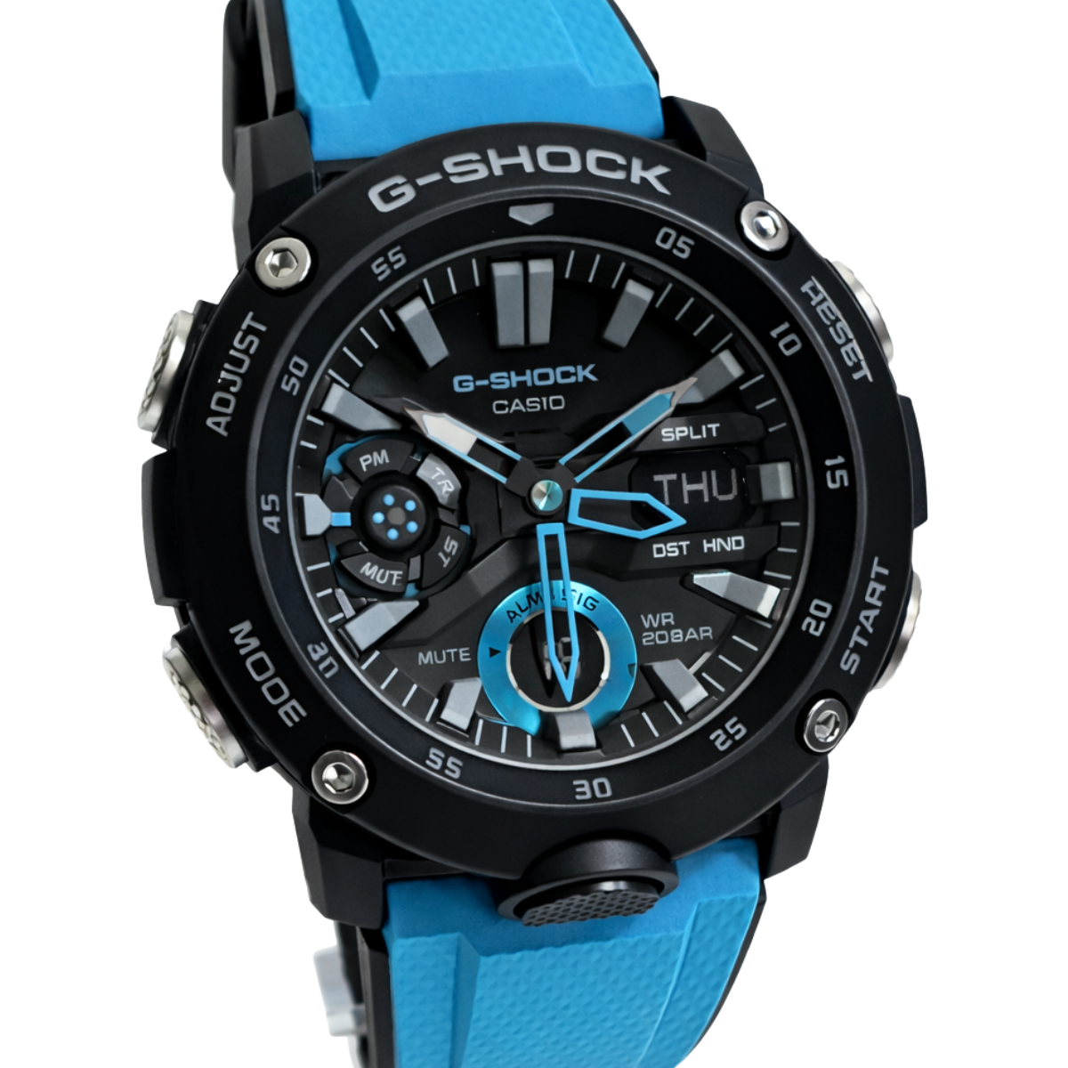Estrutura de proteção principal em carbono do G-SHOCK, o relógio que está constantemente definindo novos padrões de relógios incrivelmente resistentes, surge uma nova série com estrutura de proteção principal em carbono, que leva a resistência a um novo patamar. A caixa é feita de resina fina, que incorpora fibra de carbono, proporcionando leveza e a rigidez superior. Este material protege o módulo interno contra danos causados por choques e deformação. A tampa traseira dupla na cor preta protege a superfície traseira contra impactos. A estrutura do botão resistente a choques foi aprimorada, eliminando a necessidade de proteções externas para os botões. O visor do relógio consiste de um cursor de disco e marcadores de hora elevados, para uma aparência robusta e resistente.
