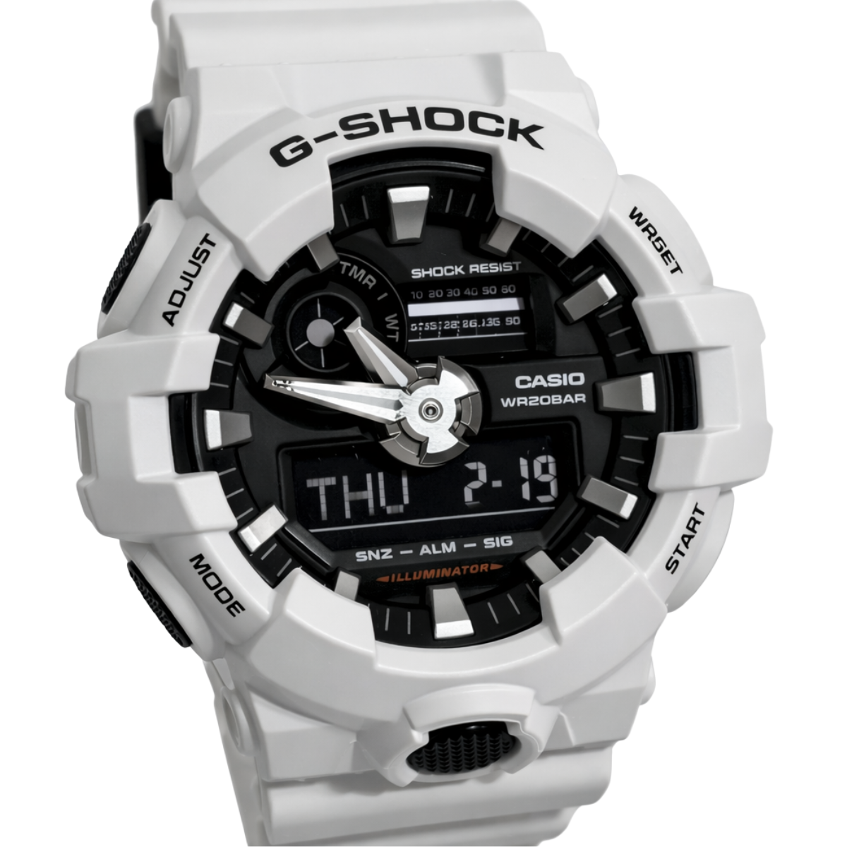 Um modelo de combinação analógico-digital com um botão frontal, o emblemático visor do G-SHOCK simbolizando a resistência, colocado na posição de 6 horas. Acabamento com estilo dinâmico, avançado e moderno. Melhora a legibilidade usando ponteiros ousados que são espessas e potentes como metal esculpido, criadas usando tecnologia de moldagem de resina proprietária para os ponteiros tridimensionais de hora e minuto. Ele também apresenta um design de visor 3D obtido ao dar tridimensionalidade ao anel do mostrador e aos índices para criar sinergia com os ousados ponteiros. Expressa tenacidade do espírito com a cor preta que simboliza o conceito da marca. O super iluminador e a função de troca de ponteiros operados pelo botão dianteiro fornecem um alto nível de usabilidade. Um G-SHOCK que combina resistência e um robusto design proprietário com um visor 3D.