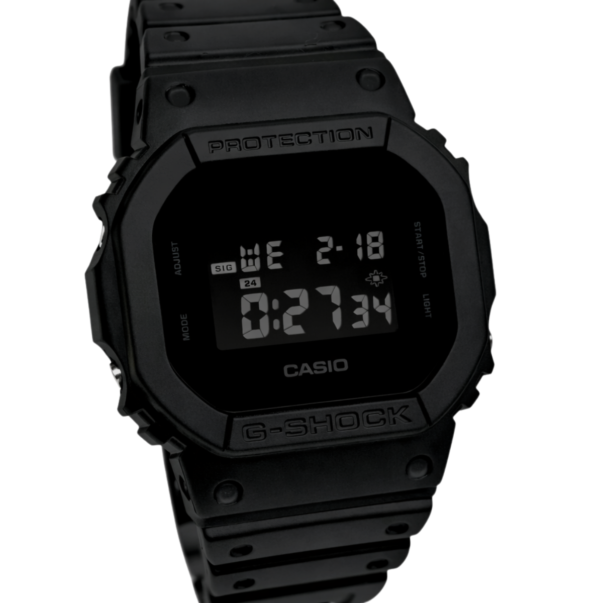 Este é um modelo G-Shock da linha "Cores Sólidas" na cor preta. O design do relógio é inteiramente preto, destacando-se pela textura minimalista e tom uniforme. O acabamento fosco no corpo e na pulseira realça tanto a simplicidade do esquema de cores quanto o formato robusto do relógio. Com um design sólido e impactante, este modelo é uma verdadeira peça de estilo.