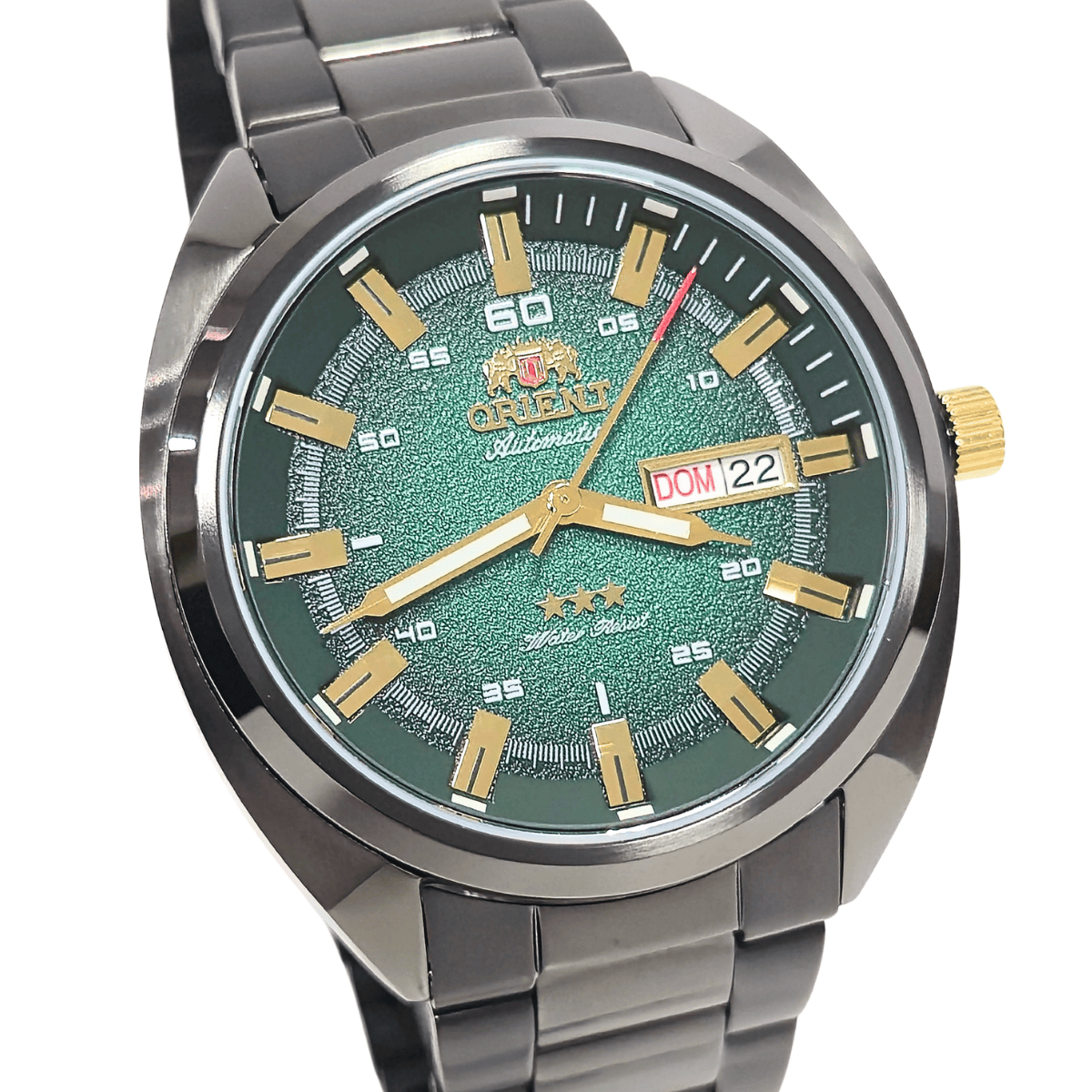 Conta com mecanismo automático, movido pelo movimento do pulso, dispensando o uso de bateria. Seu visual apresenta mostrador na cor verde, com marcadores e ponteiros harmonizados, proporcionando fácil leitura das horas. A caixa em aço inoxidável garante resistência e longa vida útil, enquanto a pulseira em aço reforça o estilo elegante e masculino.