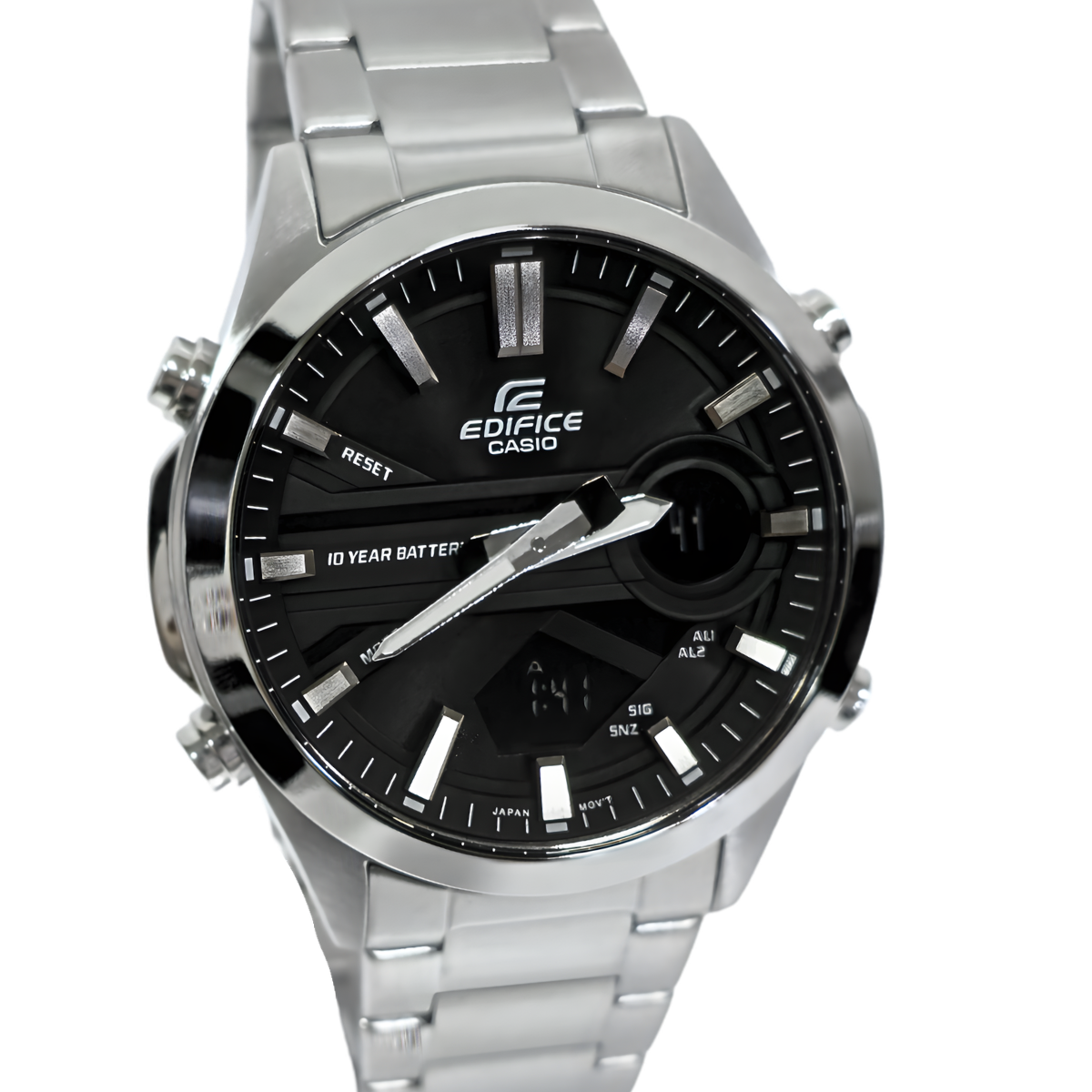 Liberte-se para ter foco na vida. Use a combinação de relógio analógico-digital EFV-C120 com uma bateria de 10 anos com a qual você não terá que se preocupar por muito tempo. O EFV-C120 assume o posto do EFV-C110, com todas as vantagens de um relógio de combinação analógico-digital e uma bateria de longa duração, mas em um design ainda mais compacto e elegante. Você vai adorar a ampla variedade de funções, incluindo hora mundial, cronômetro, alarme, temporizador de contagem regressiva e resistência à água de até 100 metros. O modelo ainda conta com Telememo - Até 30 grupos de dados, com nome de 8 caracteres e telefone de 16 dígitos.