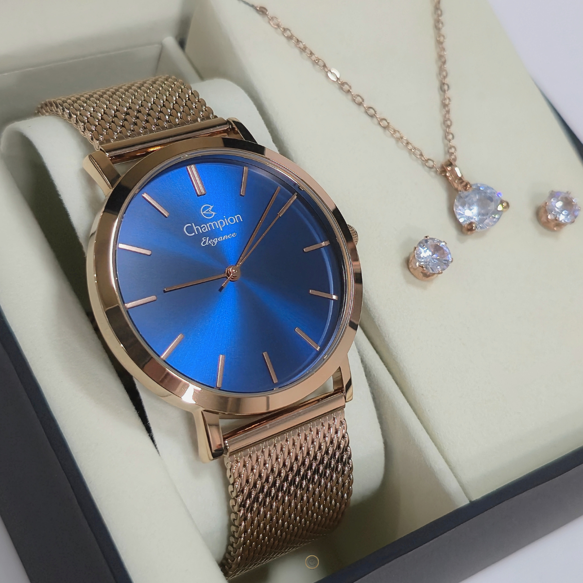Kit especial com relógio rosé, caixa em aço, marcadores fundo azul e pulseira em mesh de aço. Acompanha semijoia com colar com pingente de cristal e brinco ponto de luz. Ideal para quem gosta de combinar acessórios.