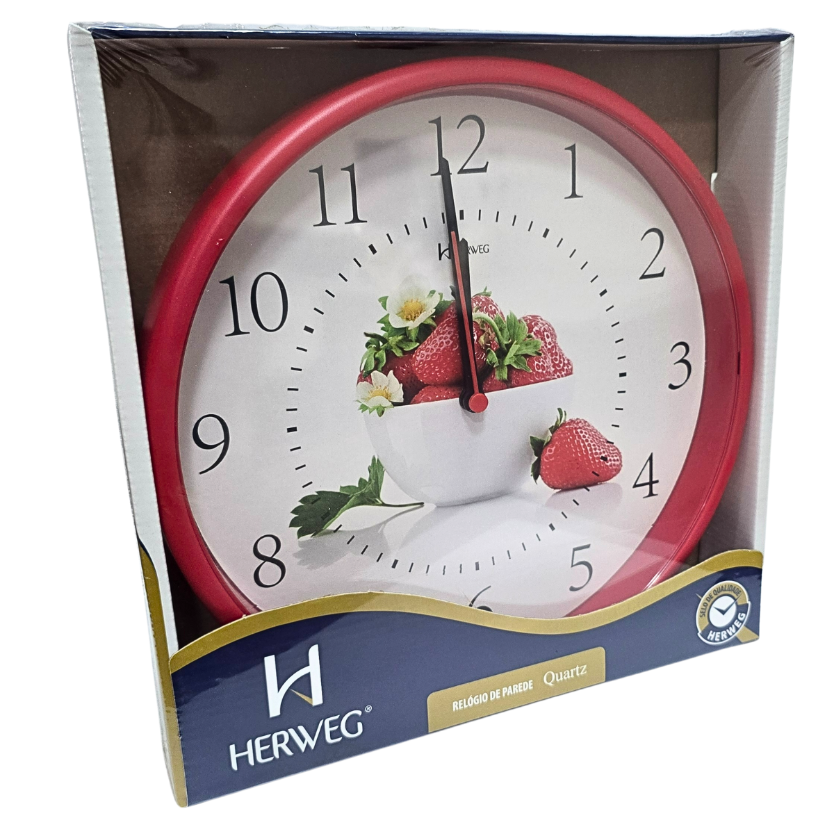 Leve mais charme e personalidade para o seu ambiente com o Relógio de Parede Herweg Quartz Vermelho Pantone Morangos 6693 – 269. Com estrutura na cor vermelho Pantone e um belo fundo decorado com morangos, este modelo combina perfeitamente funcionalidade e estilo, tornando qualquer espaço mais alegre e acolhedor.