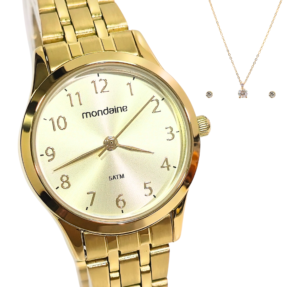 Extremamente delicado, este conjunto é um presente surpreendente. O kit exclusivo apresenta um relógio clássico dourado, com uma caixa pequena em metal e marcadores adornados por cristais. Complementando-o, a semijoia inclui um colar com um gracioso pingente de cristal e brincos delicados com ponto de luz. São elementos perfeitamente coordenados para serem usados em conjunto, proporcionando um toque refinado ao visual. O relógio em destaque possui uma caixa delicada, medindo 2,8 cm, conferindo não apenas funcionalidade, mas também uma elegância sutil a este presente especial.