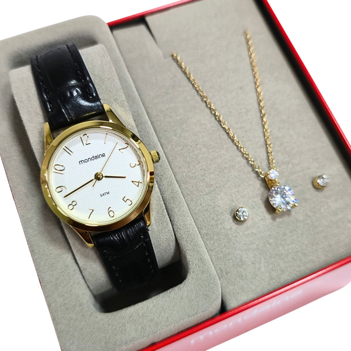 Este kit de relógio é composto por um modelo dourado com caixa em metal, mostrador branco e numeração completa. A pulseira em material sintético preto proporciona fácil ajuste e conforto ao longo do dia. O kit também inclui um par de brincos e colar foleado a ouro 18 k com pingente de pedra, que complementa o design do relógio, formando uma combinação perfeita para serem usados em conjunto e agregando um toque especial ao seu visual.