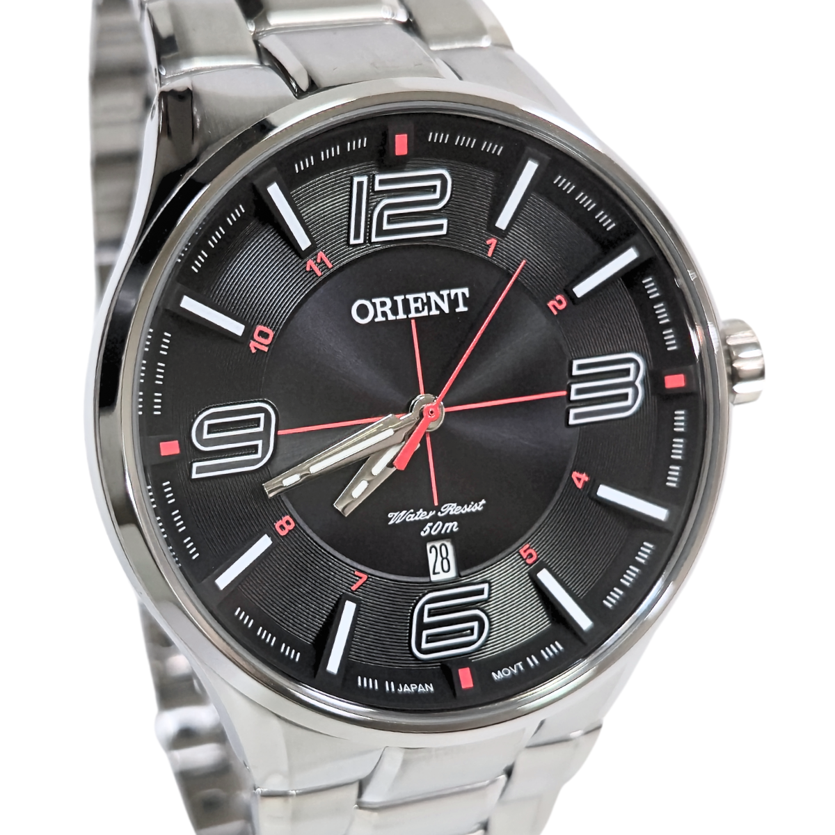 O Relógio Orient Masculino Analógico MBSS1306 combina elegância e resistência em um design clássico e versátil. Possui caixa e pulseira em aço inoxidável prateado, com acabamento escovado que garante durabilidade e um visual moderno. Seu mostrador preto, com detalhes em vermelho e com marcadores e ponteiros metálicos proporciona excelente leitura das horas, destacando o contraste sofisticado entre as cores.