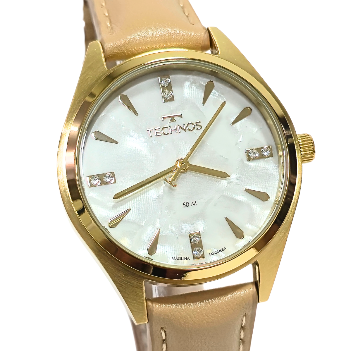 O Relógio Technos Feminino Analógico Madrepérola 2036MSB/0B é pura elegância em cada detalhe. Seu design sofisticado combina caixa dourada em aço inoxidável e pulseira em couro na cor bege com um delicado mostrador em madrepérola, que reflete a luz de forma sutil e charmosa e aplicação de pedras nos marcadores.