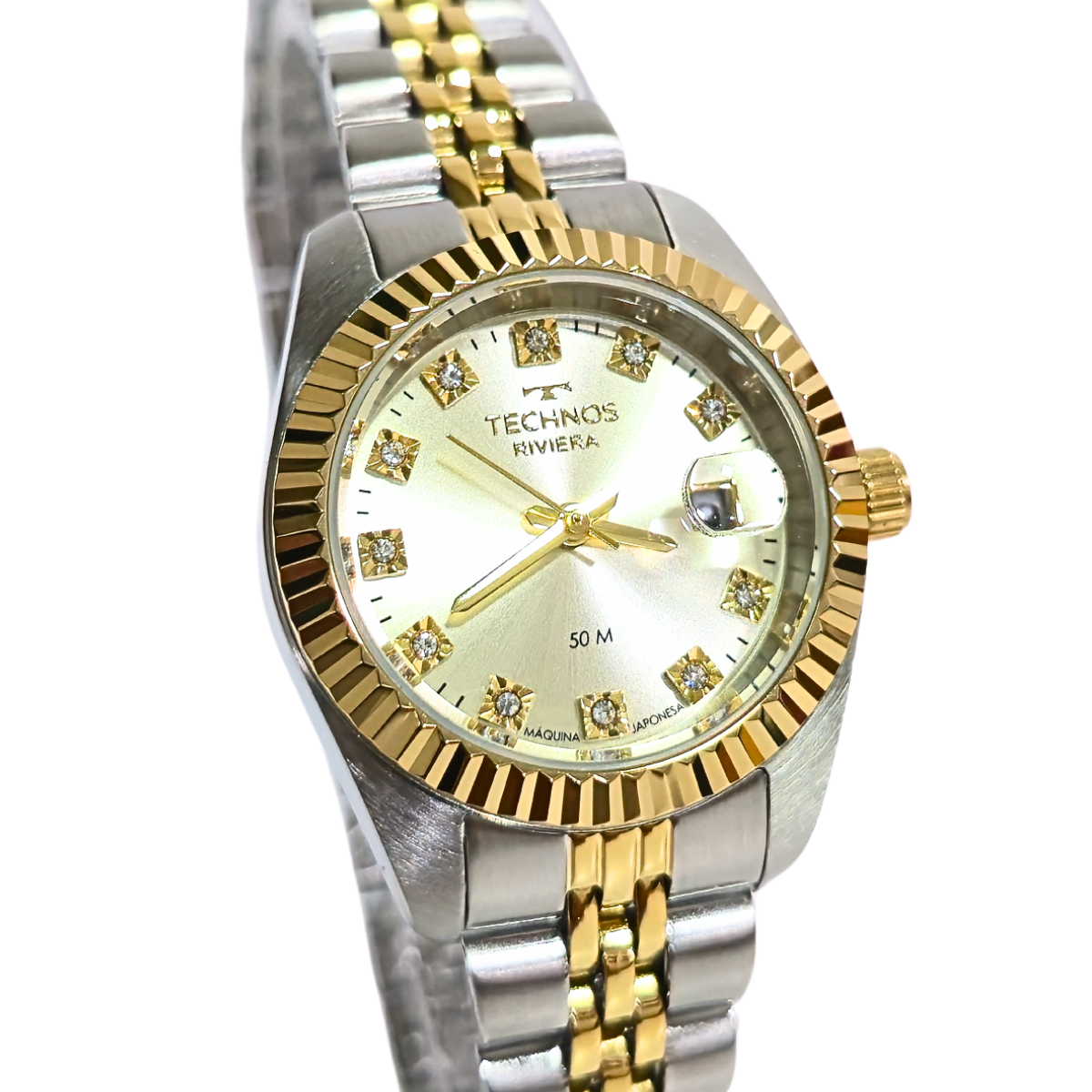 Relógio Technos Riviera feminino com caixa e pulseira de aço em banho bicolor prata com dourado. Enaltecendo a essência dos clássicos, o modelo possui o icônico aro externo corrugado e vidro com lupa de calendário, ambos elementos tradicionais do universo relojoeiro. Além da pulseira diferenciada 5 links, ele apresenta mostrador de cor champanhe, que conta com a aplicação de pedras nos marcadores de hora. Produto 100% em aço inoxidável, com máquina quartz japonesa, calendário e resistência à água de 50m.