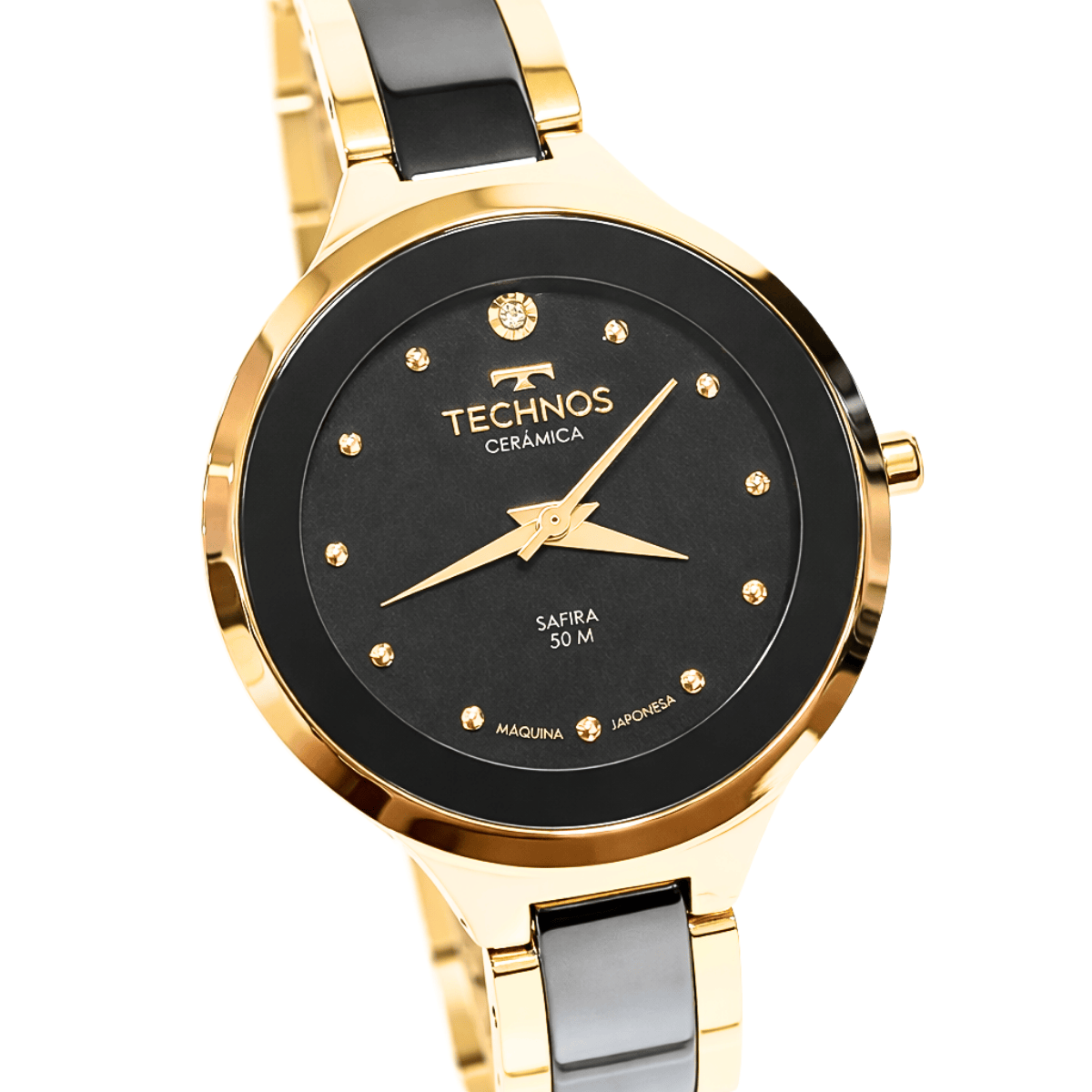 Relógio Technos Ceramic feminino preto com detalhes em dourado. Além do vidro de safira, este modelo foi desenvolvido totalmente em cerâmica, um material muito valorizado na indústria relojoeira pela vantagem de ser resistente à arranhões, livre de corrosão, leve e durável, além de conter um brilho característico inigualável.