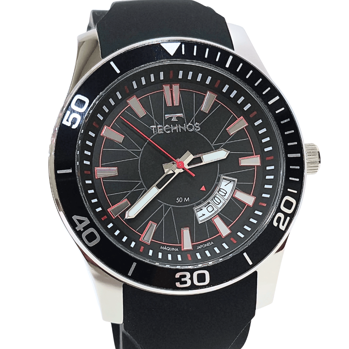 Relógio Technos Racer masculino. Inspirado no universo automobilístico, este modelo possui caixa robusta e aro de alumínio com marcação. Pulseira em silicone preto, mostrador com calendário e detalhes em vermelho se destacam dando o toque esportivo ao relógio.